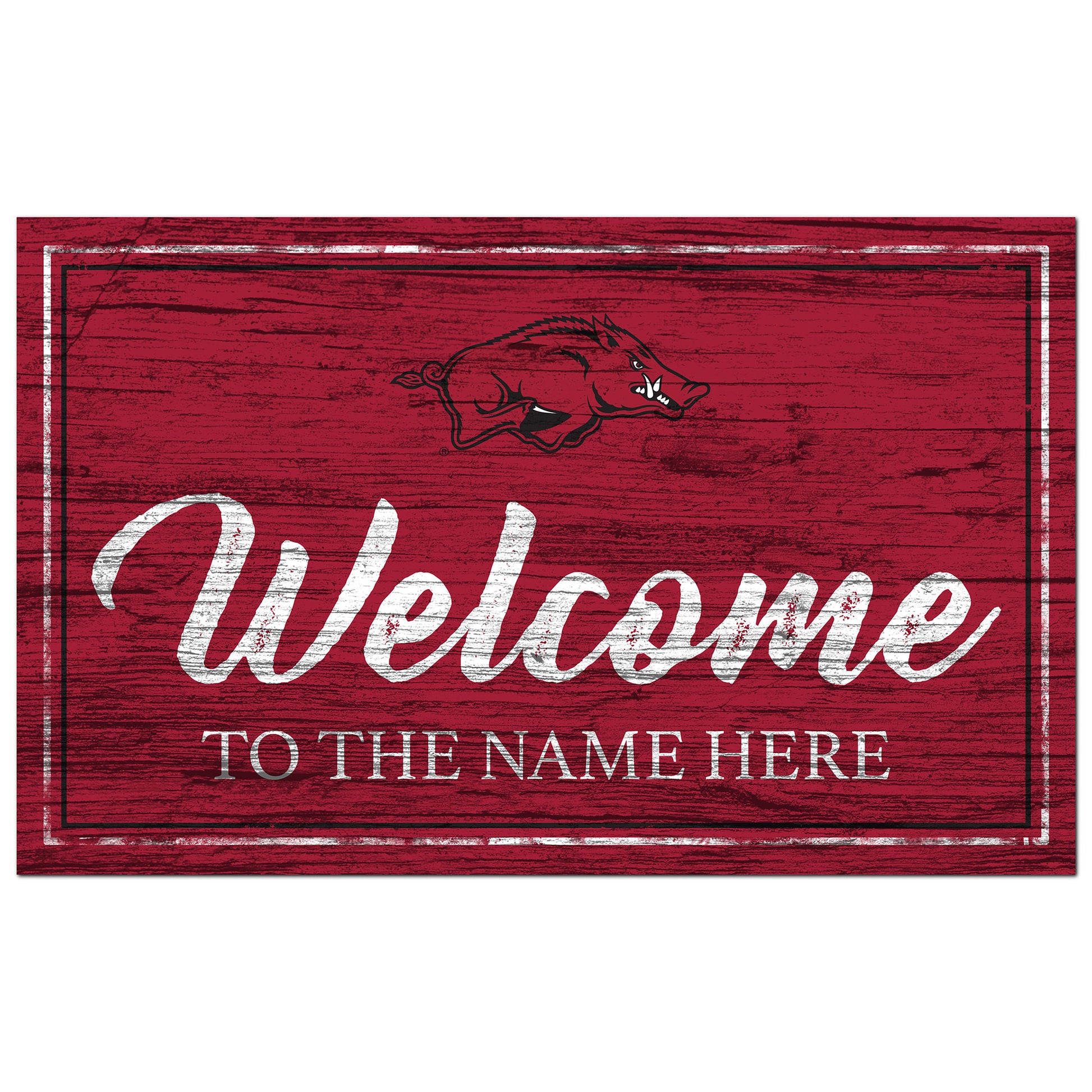We want fans to celebrate their fandom by customizing and personalizing certain products. For these customizable products, including jerseys, we invite customers to tell us how they would like their preferred name or other text to appear by typing that text into the field indicated. However, just because a customer is able to type proposed customization text into the field and is able to complete the order through the website, not all proposed customization text will be accepted. Please note, Fanatics may reject and cancel any customization order for any reason, including for messages that are deemed offensive or inappropriate. You're a hardcore Arkansas Razorbacks supporter and you love to show off your pride. Put your dedicated fandom on display with this impressive 11" x 19" Personalized Team Color Welcome Sign. Whether you put it in your fan cave or game room, this sweet sign ensures everyone knows your loyalty belongs to the Arkansas Razorbacks.