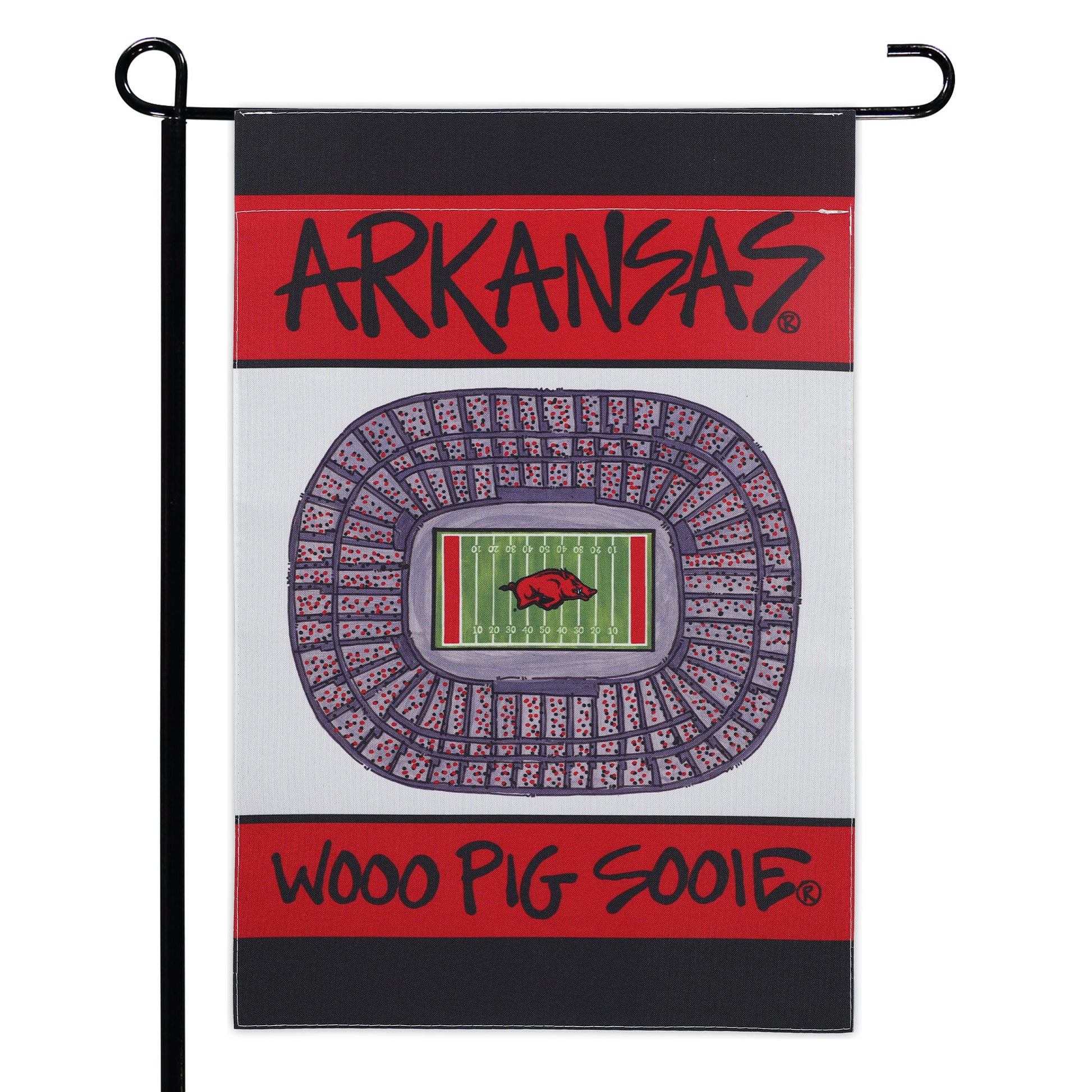 Show off your Arkansas Razorbacks pride with this 12'' x 18'' vertical banner. Its double-sided design features bold details of the team's stadium with their slogan. The two-inch sleeve at the top allows a rod to slide through for easy hanging as you rep your Arkansas Razorbacks.