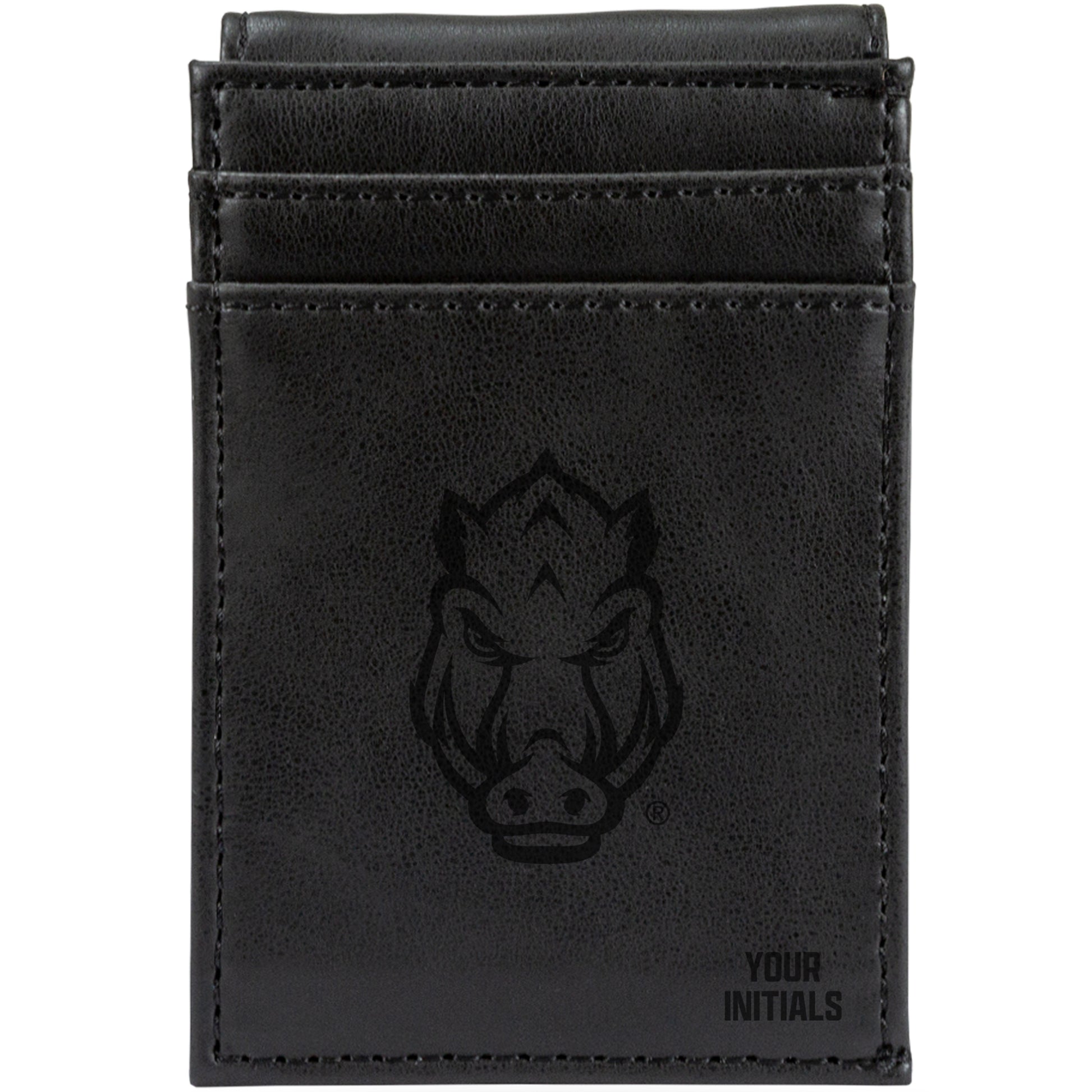 We want fans to celebrate their fandom by customizing and personalizing certain products. For these customizable products, including jerseys, we invite customers to tell us how they would like their preferred name or other text to appear by typing that text into the field indicated. However, just because a customer is able to type proposed customization text into the field and is able to complete the order through the website, not all proposed customization text will be accepted. Please note, Fanatics may reject and cancel any customization order for any reason, including for messages that are deemed offensive or inappropriate. Carry your Arkansas Razorbacks pride everywhere you go with this Personalized Front Pocket Wallet. The leather design and laser engraved graphics make for a classic, quality look. With plenty of room for your cash and cards, this wallet will keep your essentials secure while displaying your Arkansas Razorbacks spirit.
