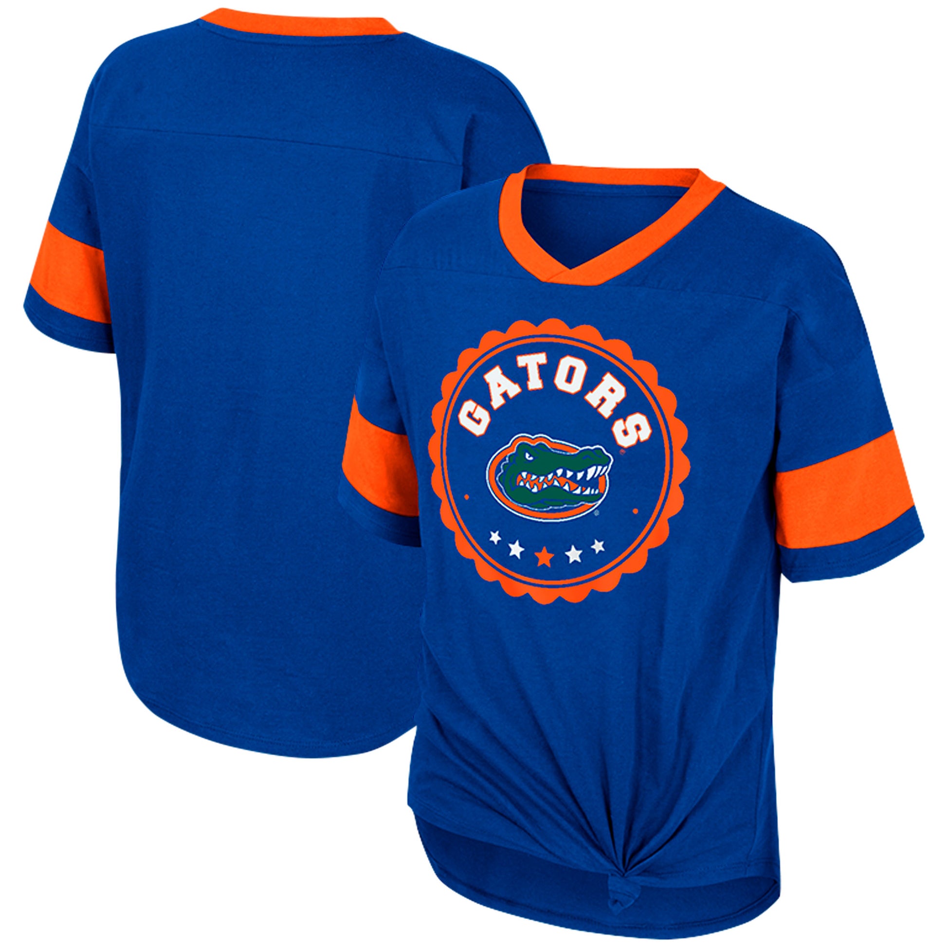 Help your blossoming Florida Gators fan elevate their fandom by adding this Colosseum Tomika V-neck T-shirt to their collection. The rounded droptail hem provides extra coverage while the soft fabric adds comfort to game days. Vivid Florida Gators graphics, bold sleeve stripes and the stylish front tie ensure your kiddo's style is shown off loud and proud.