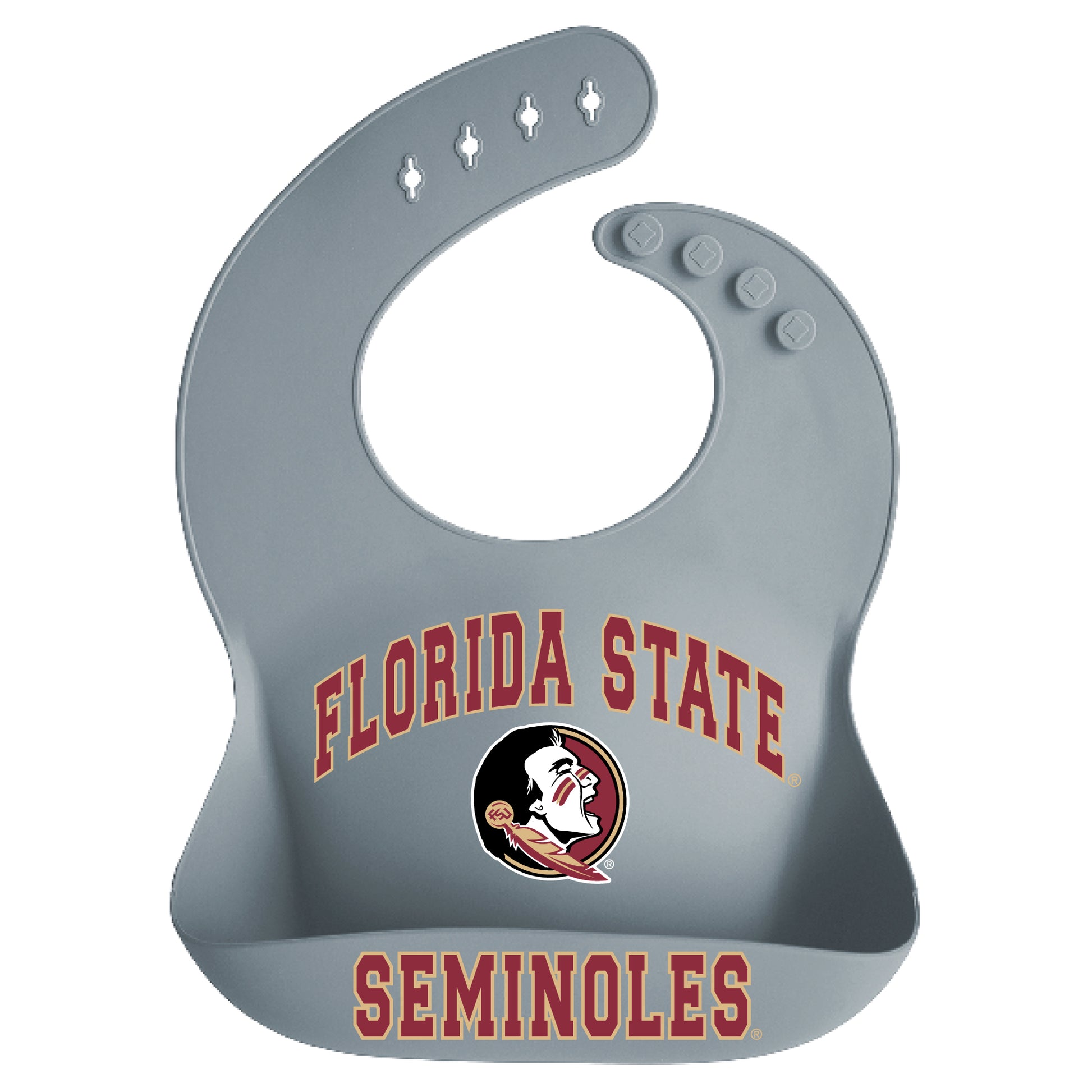 Meal-time cleanup is no longer a chore thanks to this Florida State Seminoles Silicone Crumb Catcher Bib. Feeding an infant can get messy, but Garb provides a major assist with a high-quality, silicone-safe design aimed at keeping food off your floor. It is lightweight, easy to clean and won't impede your young Florida State Seminoles fan as they load up on nutrients.