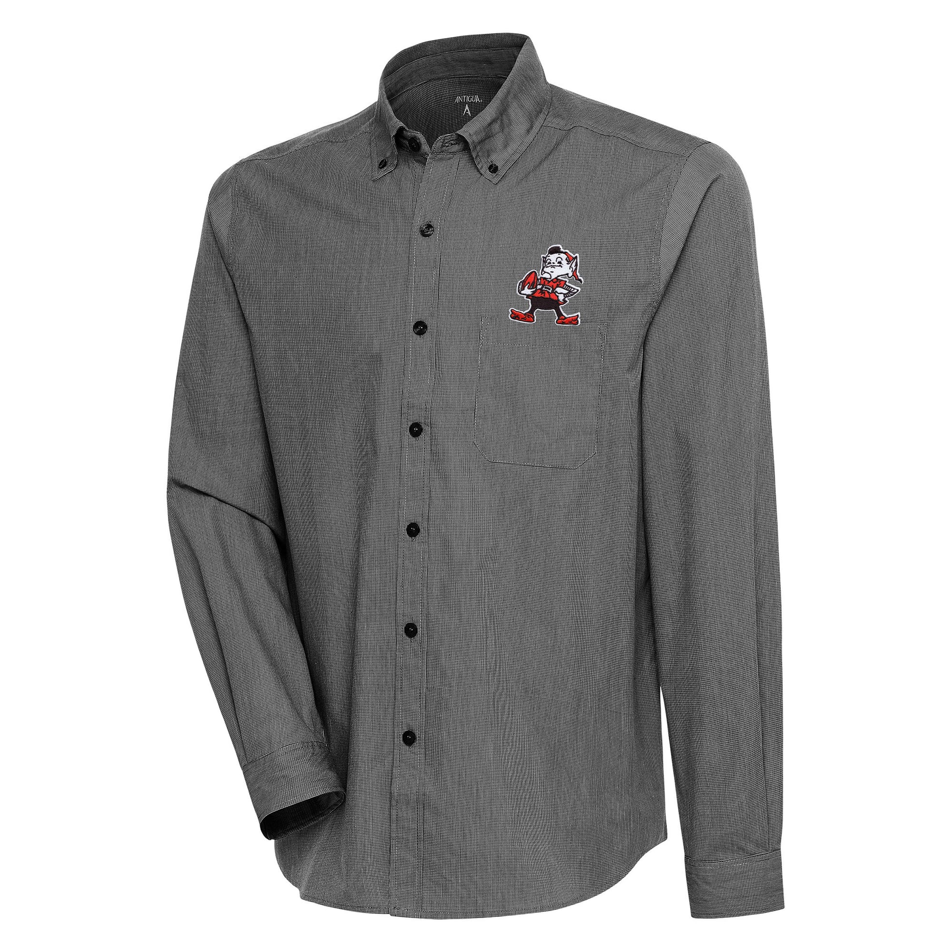 The Antigua Black/White Cleveland Browns Compression Tri-Blend Long Sleeve Button-Down Shirt is the perfect way to show your support for the Cleveland Browns. Made from a comfortable cotton, polyester, and spandex blend, this shirt features a classic fit and embroidered, heat-sealed patch graphics that proudly display your team pride. The self-fabric top set placket, left chest pocket, and sleeve placket add a touch of style, while the pleat detail at the back ensures easy movement. Whether you're cheering on the Browns at the stadium or just showing your support around town, this shirt is sure to turn heads.
