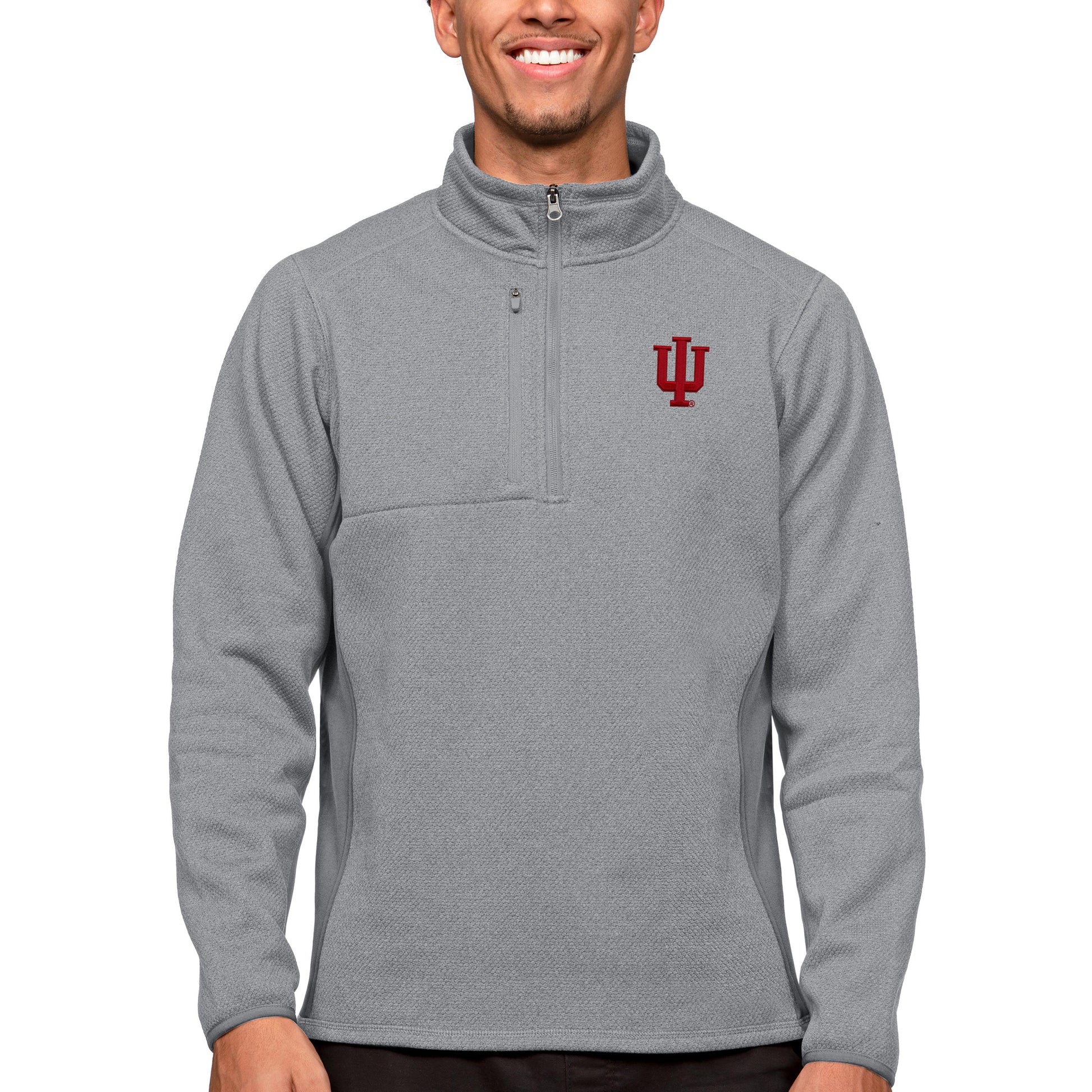 Represent your Indiana Hoosiers with pride in this Antigua Course Quarter-Zip Pullover Top. This lightweight pullover features embroidered Indiana Hoosiers graphics and fleece back insets for added warmth. The quarter-zip closure and right chest zippered pocket make it easy to adjust your comfort level. Whether you're cheering on the Hoosiers at Assembly Hall or just relaxing at home, this pullover is the perfect way to show your team spirit.