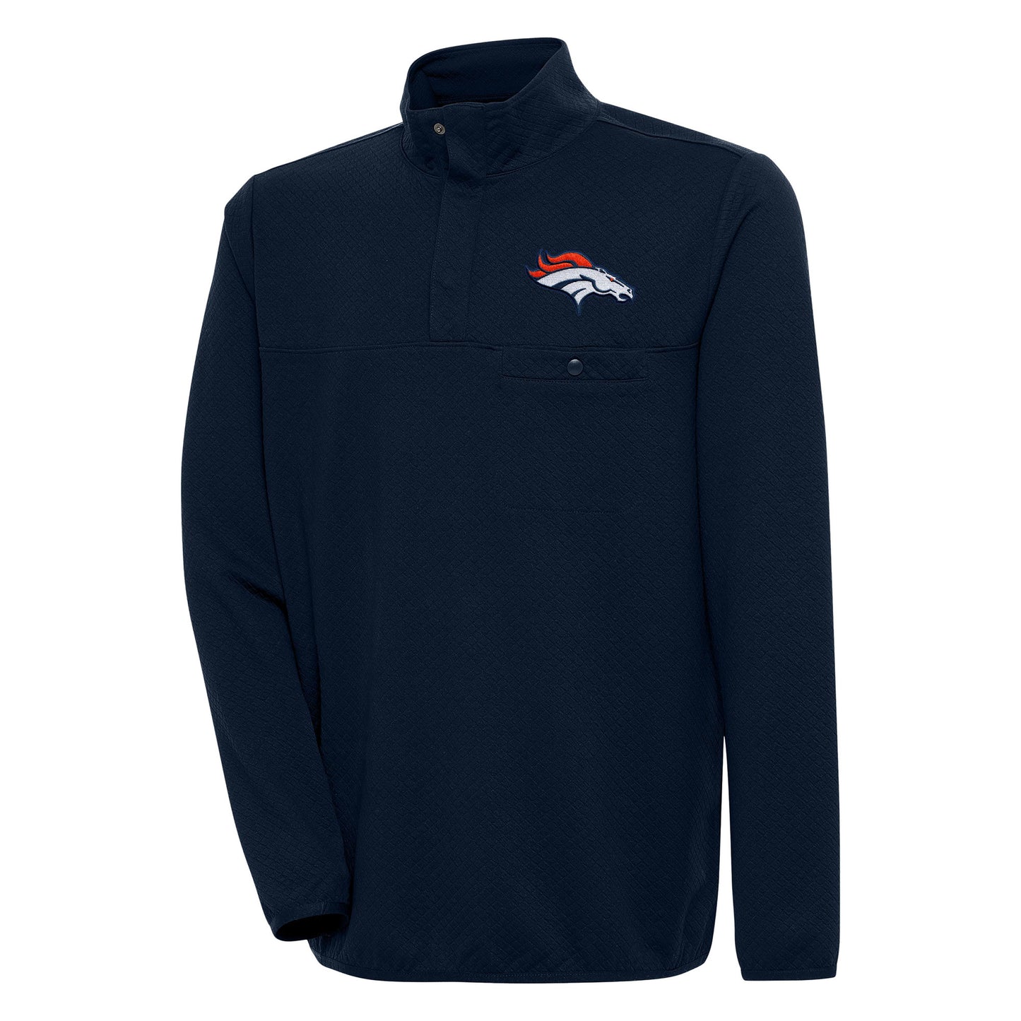 Show your Denver Broncos spirit with this Antigua Streamer Quarter-Snap Pullover Jacket. This midweight pullover features a diamond texture fabric and elastic trim at the sleeve and bottom hem for a comfortable fit. The embroidered Denver Broncos patch graphic and quarter-snap placket add a touch of team spirit. Whether you're at Empower Field at Mile High or watching from home, this pullover will keep you warm and stylish while you cheer on the Denver Broncos.