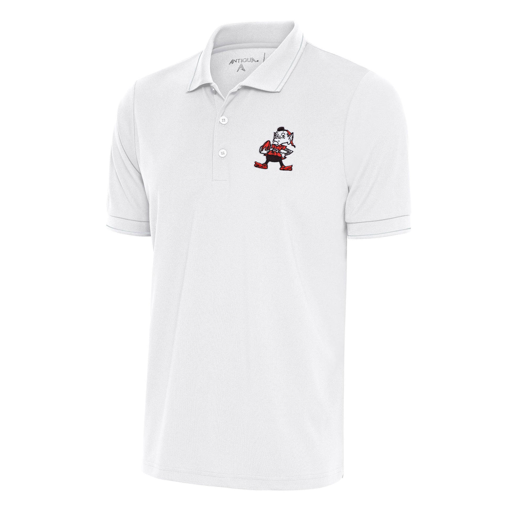 The Men's Antigua White Cleveland Browns Team Logo Throwback Affluent Big & Tall Polo is a stylish and comfortable choice for any Browns fan. Its vintage heat-sealed graphics and tipped flat knit collar and cuffs add a touch of retro flair, while the three-button placket ensures a secure fit. Made from durable polyester, this polo is perfect for showing your support for the Cleveland Browns both on and off the field.