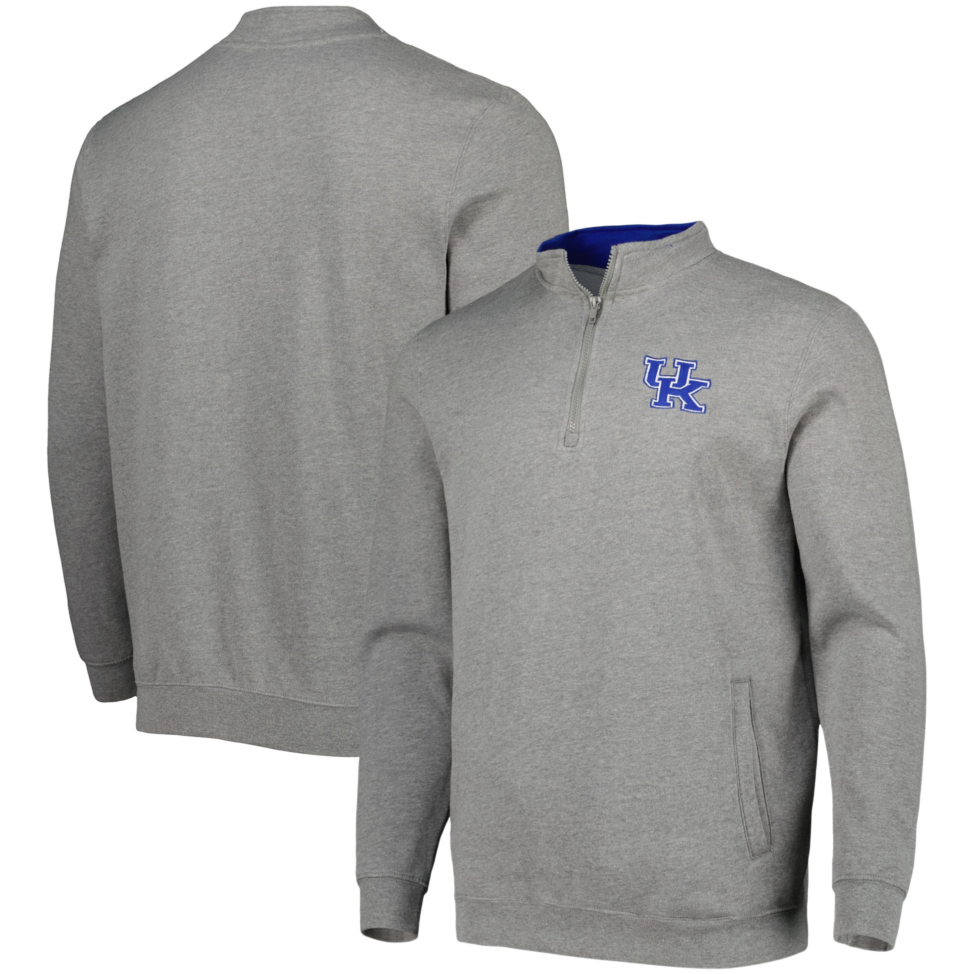 The Men's Colosseum Heathered Gray Kentucky Wildcats Tortugas Quarter-Zip Sweatshirt is the perfect way to show unwavering support for the Kentucky Wildcats. Crafted from a soft cotton and polyester blend, this midweight sweatshirt ensures comfort and warmth during chilly game days. The embroidered fabric applique proudly displays the Kentucky Wildcats logo, while the Olympic collar and two front pockets add style and functionality. Whether cheering from the stands or showing support, this quarter-zip sweatshirt is the perfect way to represent the Kentucky Wildcats in style.
