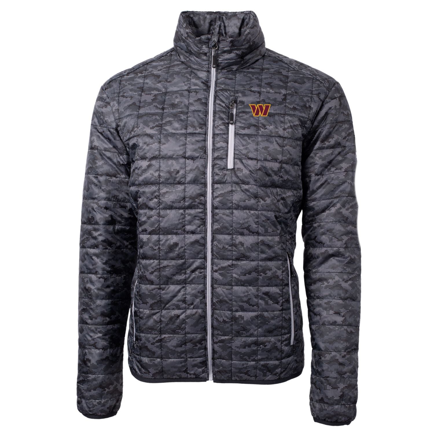 Stay warm and show your Washington Commanders pride with this Cutter & Buck Rainier PrimaLoft Printed Full-Zip Puffer Jacket. This heavyweight jacket is perfect for cold temperatures, with a wind and water-resistant design to keep you comfortable. The all-over camo design and embroidered Washington Commanders graphics show off your team spirit, while the fully lined interior and insulated mock-neck collar provide extra warmth. Whether you're at FedEx Field or watching from home, this jacket will keep you warm and stylish while you cheer on the Washington Commanders.