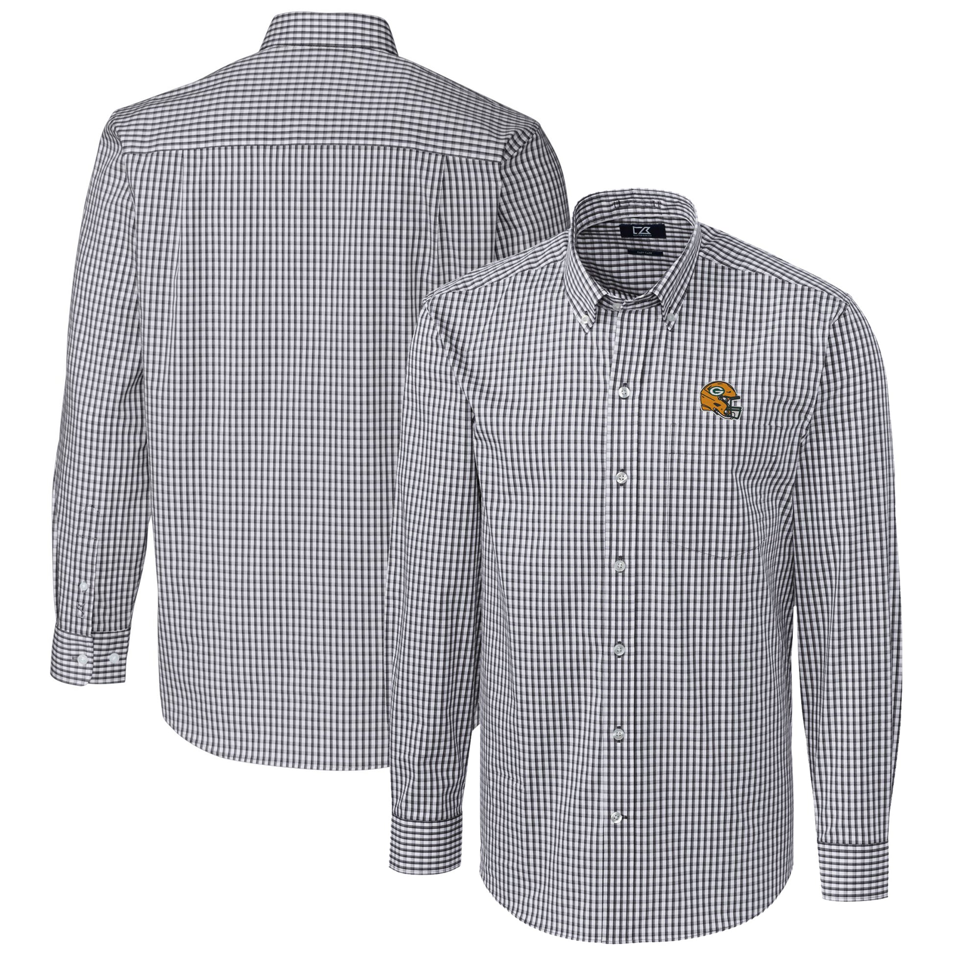 Men's Cutter & Buck Charcoal Green Bay Packers Helmet Easy Care Stretch Gingham Long Sleeve Button-Down Shirt