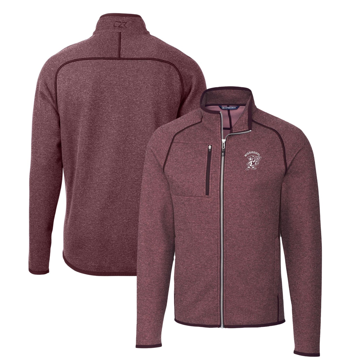 Stay warm and show your Mississippi State Bulldogs spirit with this Cutter & Buck Mainsail Sweater-Knit Full-Zip Jacket. This jacket features embroidered Mississippi State Bulldogs graphics and a CB Pennant embroidery at the back collar. The full-zip closure and front welt pockets with zip closure make it easy to wear and store your belongings, while the tonal stretch binding at the sleeve and bottom hem provides a comfortable fit. This jacket is perfect for game day or any day you want to show your Mississippi State Bulldogs pride.
