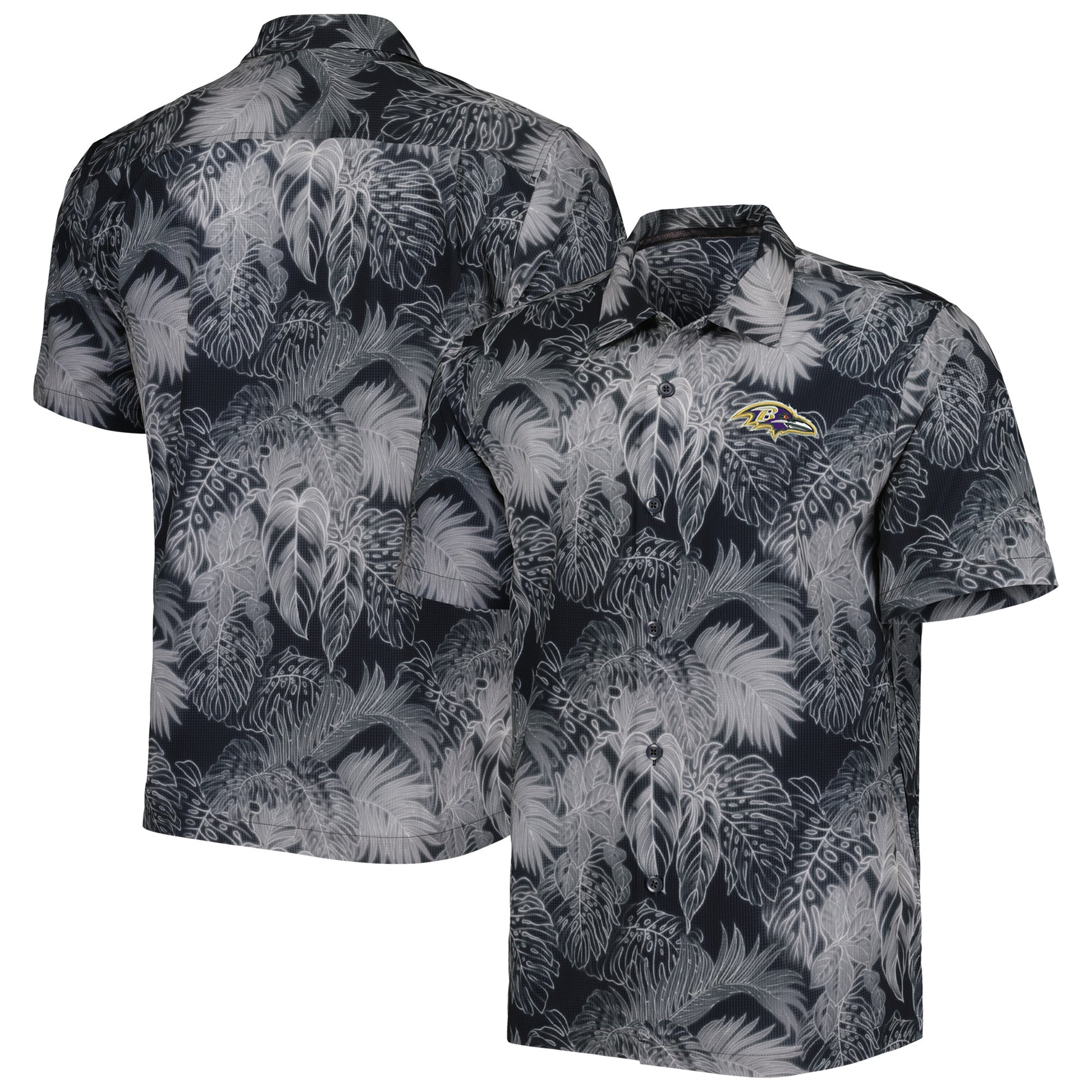 The Tommy Bahama Black Baltimore Ravens Big & Tall Bahama Coast Luminescent Fronds Camp IslandZone Button-Up Shirt is the perfect way to show unwavering support for the Baltimore Ravens. This stylish shirt features embroidered Ravens graphics, a full-button front, and a hem with side splits. The sublimated design adds a touch of flair, while the IslandZone fabric technology keeps you cool and comfortable all day long. Whether you're cheering on the Ravens at the stadium or relaxing at home, this shirt is sure to become a favorite.