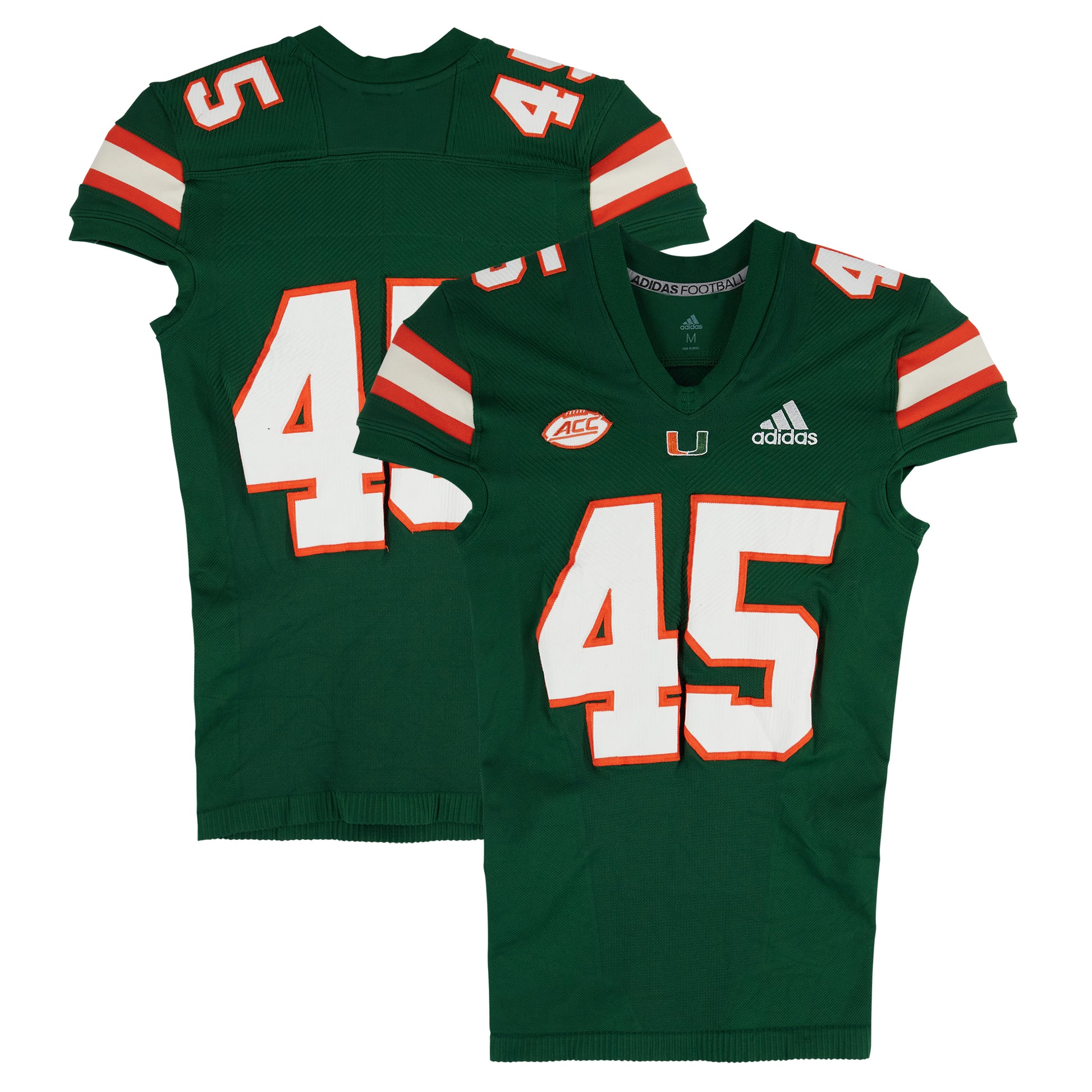 Take your collection of Miami Hurricanes memorabilia to the next level with this Team-Issued adidas #45 Green Jersey from the Football Program - Size M. This official piece of game-day gear was built to team and player specifications for unmatched on-field performance. It comes complete with a Certificate of Authenticity, making it an unforgettable addition to any Miami Hurricanes fan's collection.