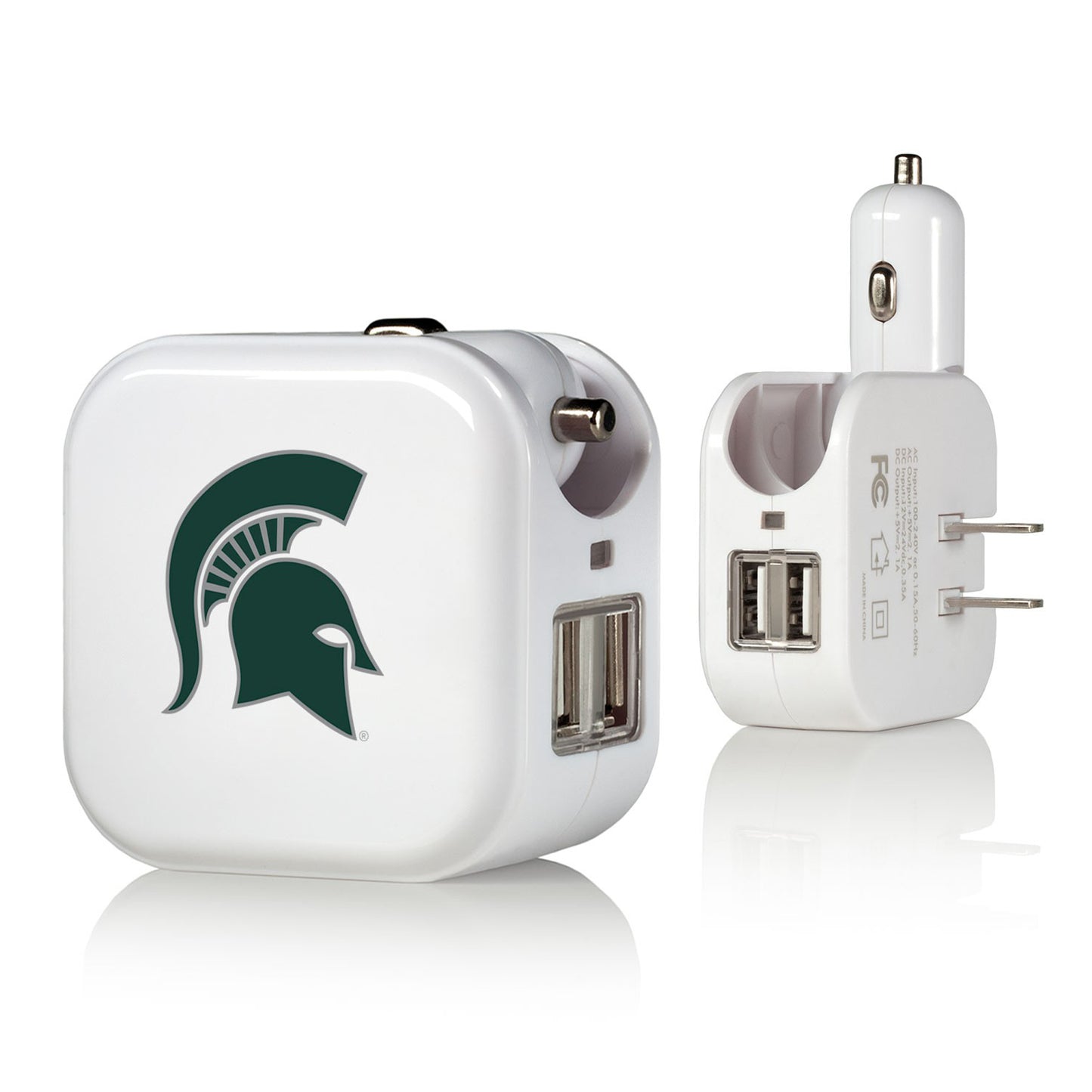 This Insignia USB Charger shows off your love for Michigan State Spartans. It is compatible with a standard wall outlet or a car outlet and has duel USB ports so you can charge up to two devices at a time. Complete with digitally printed Michigan State Spartans graphics, this accessory lets you rep your fandom while you charge.