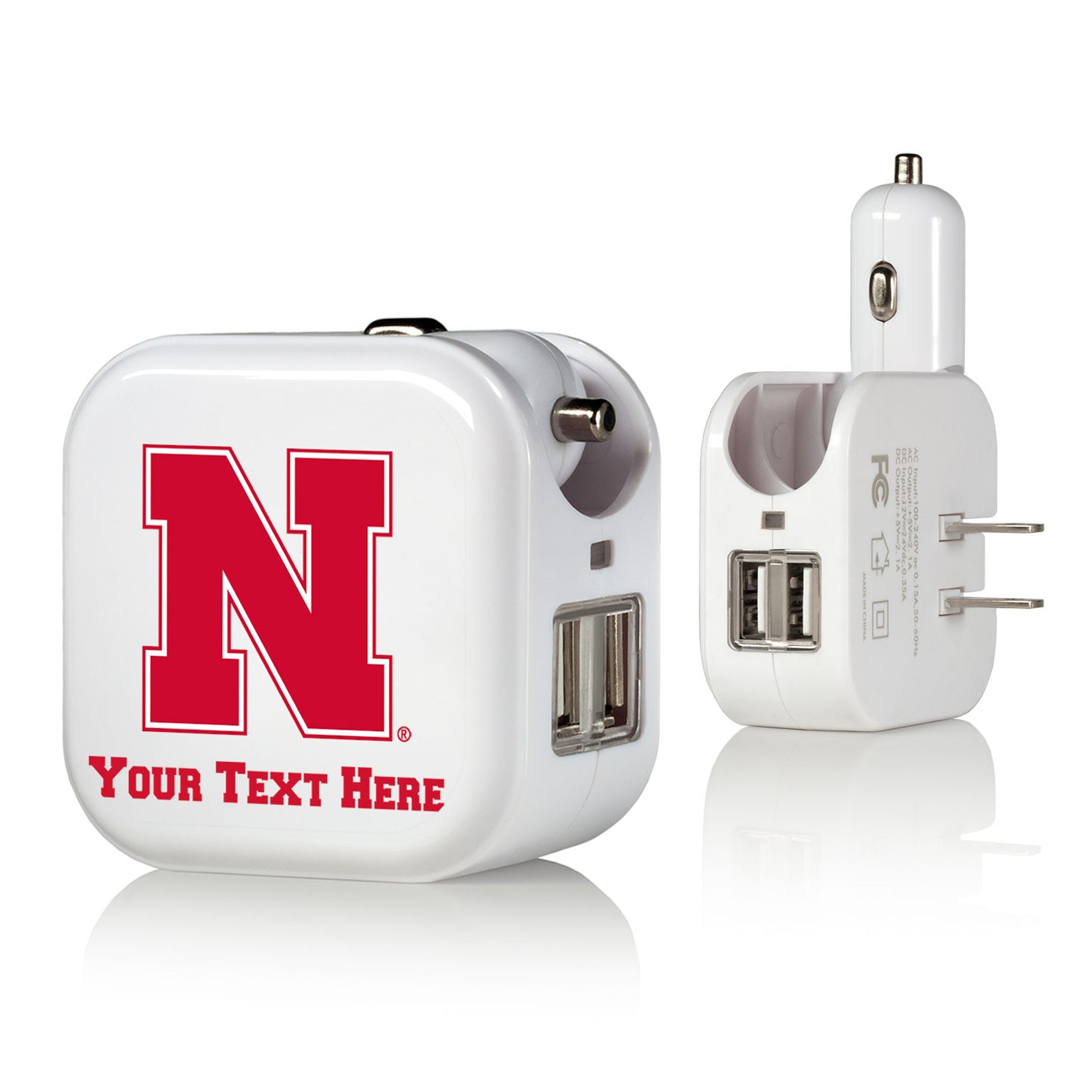 We want fans to celebrate their fandom by customizing and personalizing certain products. For these customizable products, including jerseys, we invite customers to tell us how they would like their preferred name or other text to appear by typing that text into the field indicated. However, just because a customer is able to type proposed customization text into the field and is able to complete the order through the website, not all proposed customization text will be accepted. Please note, Fanatics may reject and cancel any customization order for any reason, including for messages that are deemed offensive or inappropriate.This Personalized 2-In-1 USB Charger is a must-have for Nebraska Huskers fans. It is compatible with a wall or car outlet and allows you to charge two devices at the same time. It features printed Nebraska Huskers graphics so your fandom is always on full display.