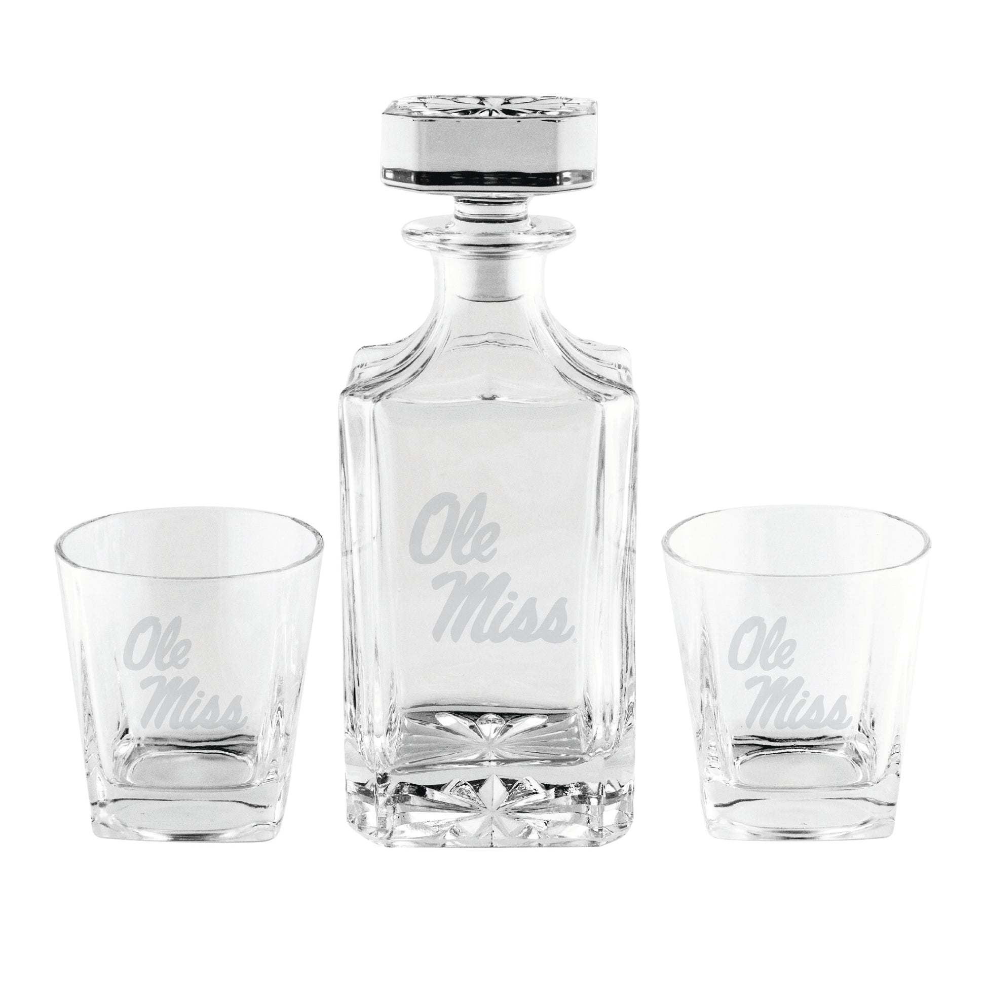 Toast another Ole Miss Rebels victory in timeless style with this Three-Piece Decanter Set. A 23oz. decanter is accompanied by two 8oz. rocks glasses, each featuring etched Ole Miss Rebels graphics. The entire set is dishwasher and microwave-safe for easy use all season long.