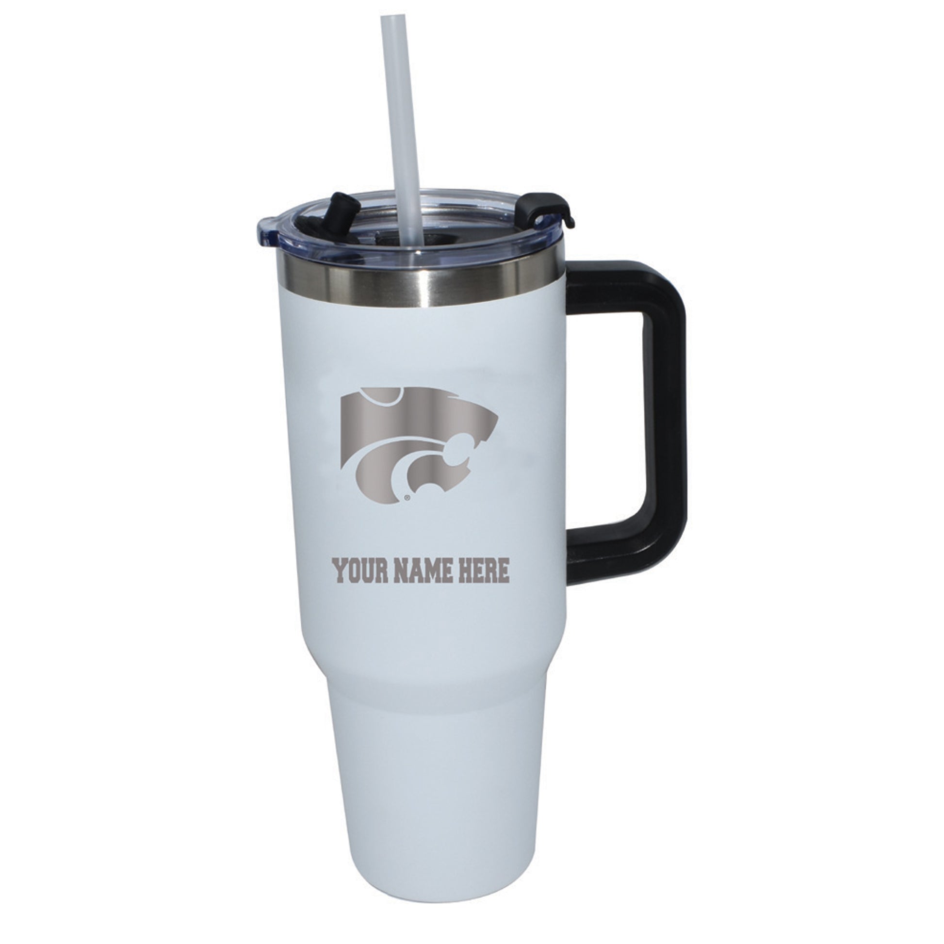 We want fans to celebrate their fandom by customizing and personalizing certain products. For these customizable products, including jerseys, we invite customers to tell us how they would like their preferred name or other text to appear by typing that text into the field indicated. However, just because a customer is able to type proposed customization text into the field and is able to complete the order through the website, not all proposed customization text will be accepted. Please note, Fanatics may reject and cancel any customization order for any reason, including for messages that are deemed offensive or inappropriate. Sip your beverages with a little bit of Kansas State Wildcats pride with this Personalized White 46oz. Colossal Tumbler. It features vibrant team graphics to show off your unwavering Kansas State Wildcats spirit. Plus, the stainless steel material will keep your drink at the perfect temperature, while the convenient handle makes it easy to enjoy your favorite drink whenever you want.