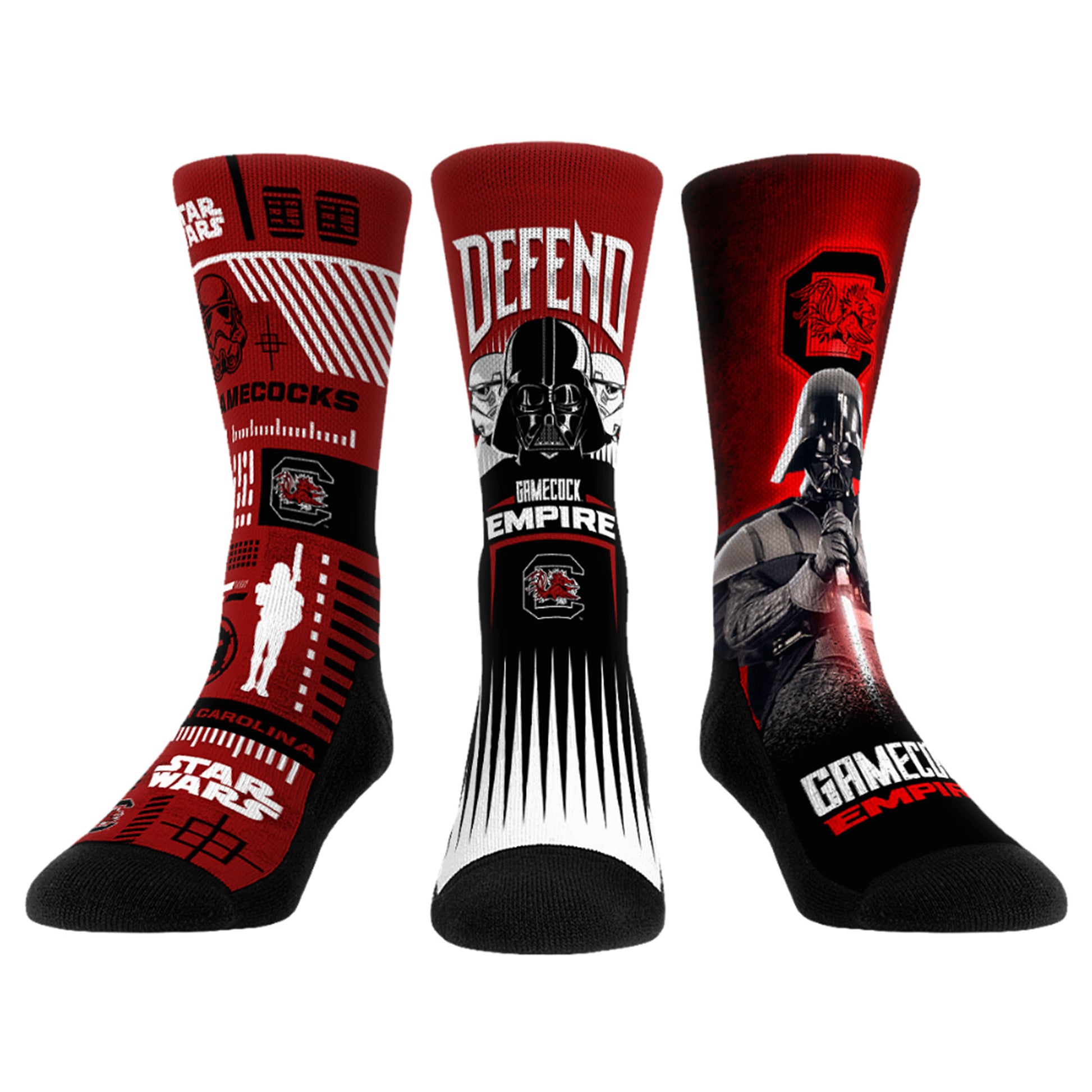 Embrace the true power of the dark side with these South Carolina Gamecocks Darth Vader & Stormtrooper Star Wars Three-Pack Crew Socks Set from Rock Em Socks. This pack comes with three socks with three unique designs for your team. The out-of-this-world South Carolina Gamecocks and Star Wars designs are sure to be a hit with any fan.