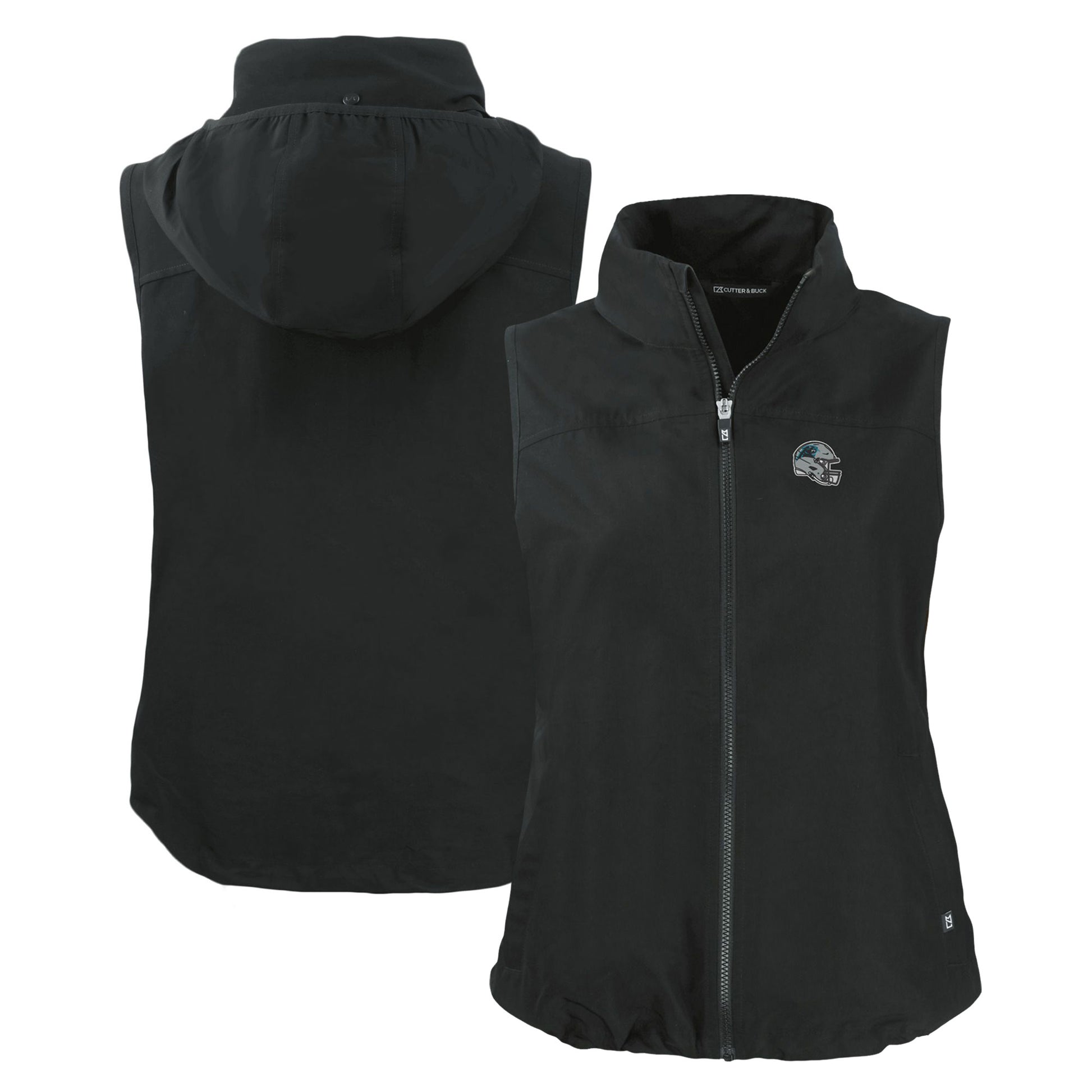 Represent your Carolina Panthers with pride in this Women's Cutter & Buck Black Carolina Panthers Helmet Logo Charter Eco Recycled Full-Zip Vest. This Carolina Panthers vest is made from recycled polyester and features a DWR water-resistant finish, so you can stay dry and comfortable in any weather. The attached packable pouch makes it easy to take with you wherever you go, and the adjustable elastic drawcord at the hem ensures a perfect fit. Whether you're tailgating at Bank of America Stadium or watching the game from home, this vest will keep you warm and stylish all season long.
