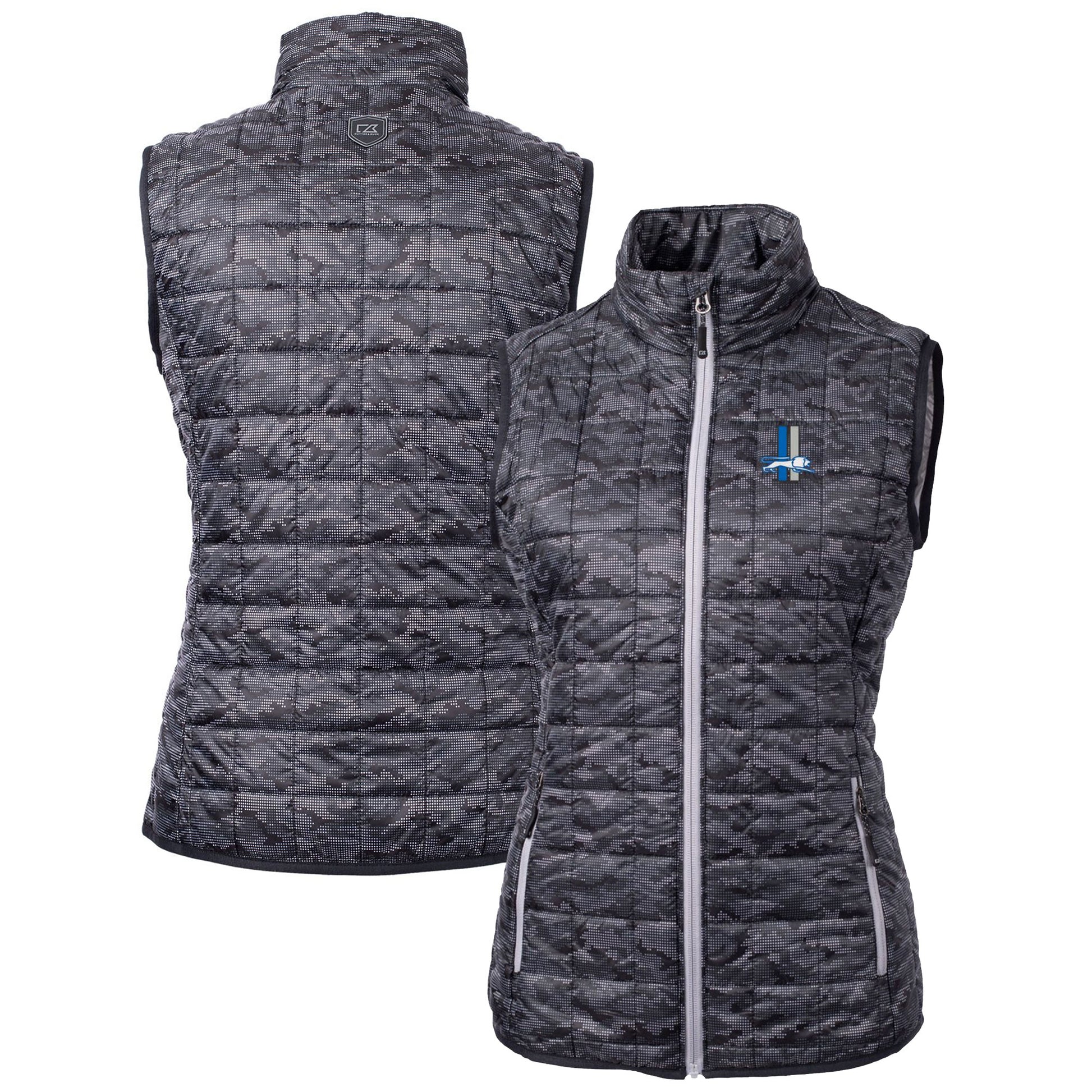 Celebrate your Detroit Lions fandom in style with the Women's Cutter & Buck Throwback Logo Rainier PrimaLoft Eco Printed Full-Zip Puffer Vest. This heavyweight vest is perfect for cold weather, with a wind and water-resistant design to keep you comfortable. The all-over camo design and embroidered Detroit Lions graphics show off your team spirit, while the full-zip closure and zippered front pockets provide convenience and storage. Whether you're tailgating at Ford Field or watching the game from home, this vest will keep you warm and stylish all season long.