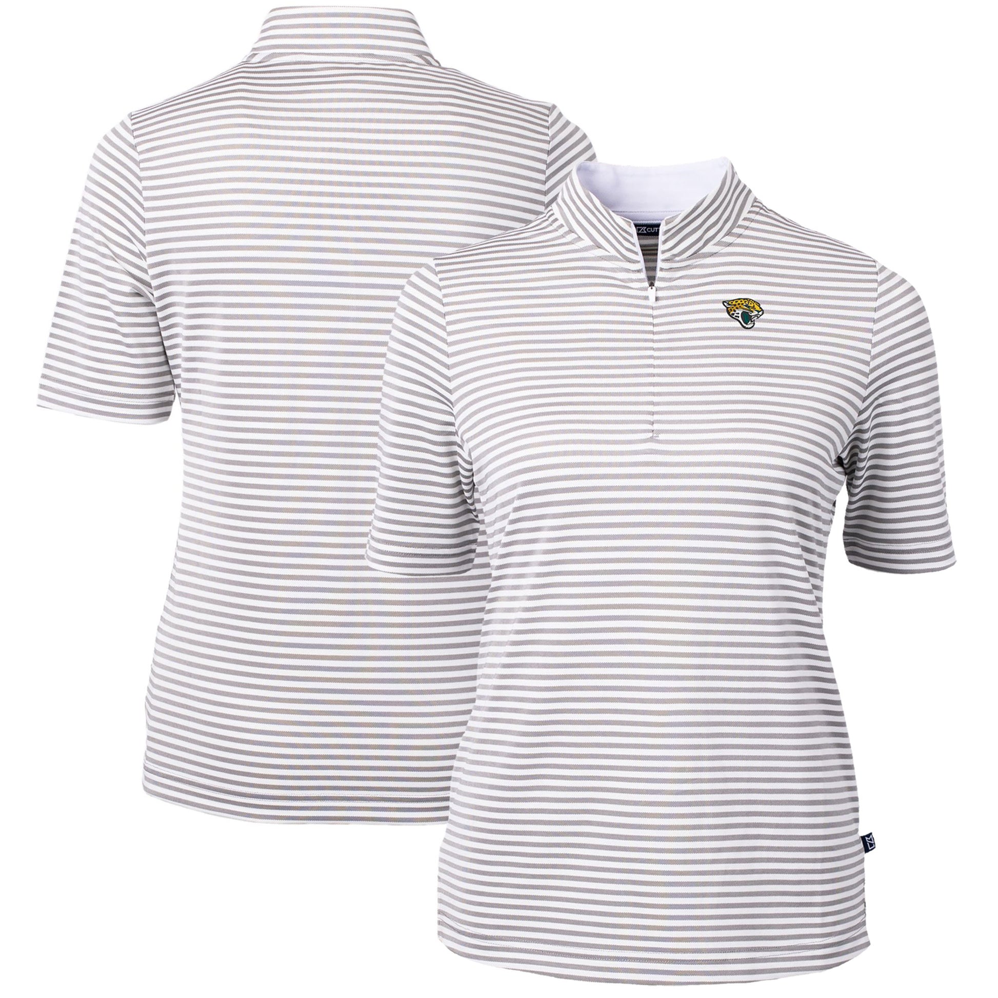 Represent your Jacksonville Jaguars with pride in the Women's Cutter & Buck Gray Jacksonville Jaguars DryTec Virtue Eco Pique Stripe Recycled Polo. Crafted from recycled polyester, polyester, and spandex pique, this polo features moisture-wicking fabric and four-way stretch for ultimate comfort and performance. The self-fabric collar and zippered placket add a touch of sophistication, while the CB logo trims and embroidered Jacksonville Jaguars graphics proudly display your unwavering support for the team.