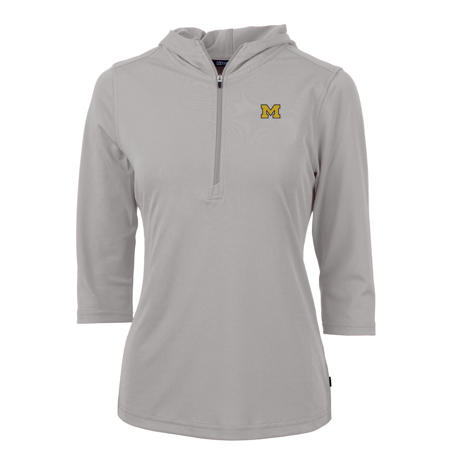 Women's Cutter & Buck Gray Michigan Wolverines Virtue Eco Pique 3/4 Sleeve Half-Zip Pullover Hoodie