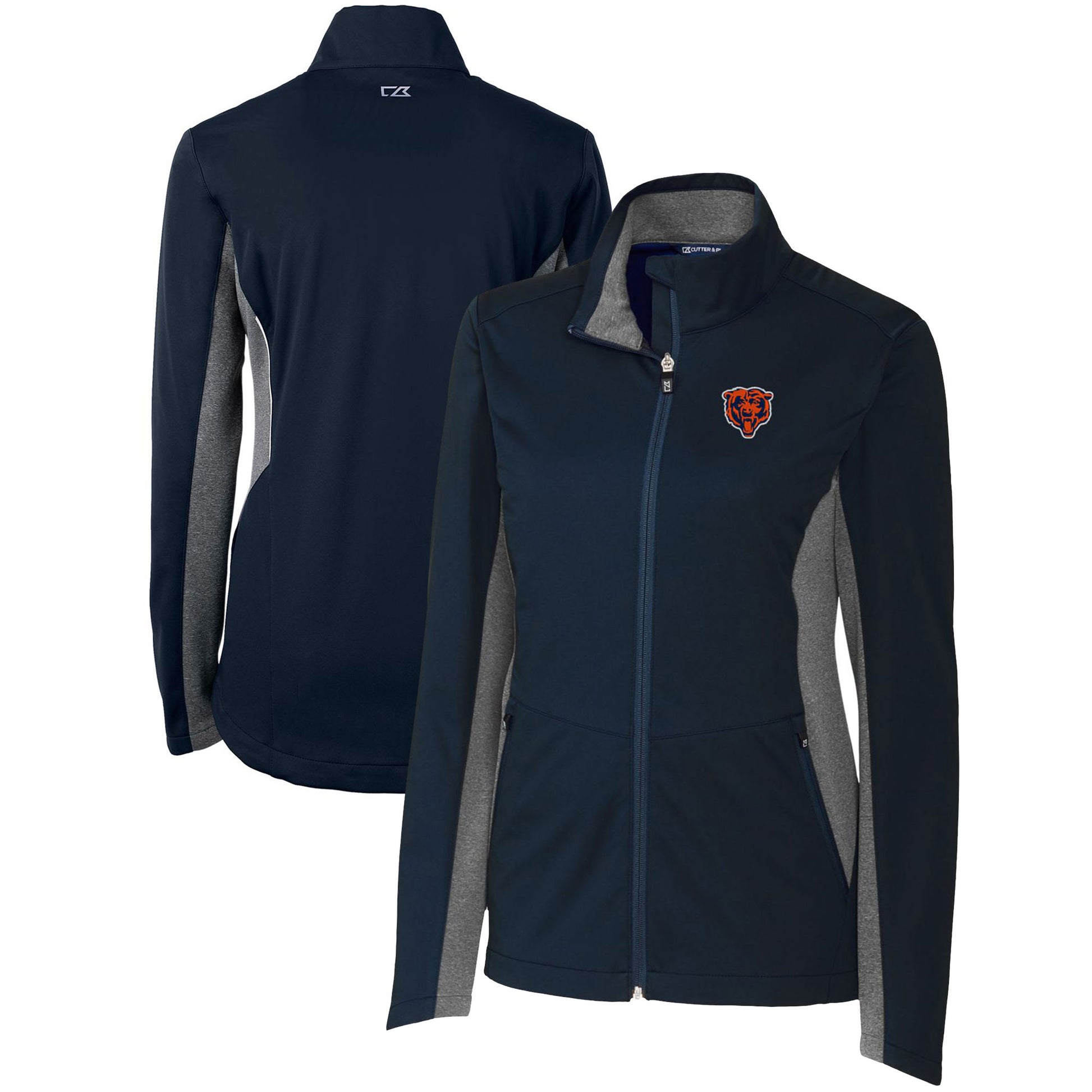 Celebrate your Chicago Bears fandom with the Women's Cutter & Buck Navy Chicago Bears Throwback Logo Navigate Softshell Full-Zip Jacket. This lightweight, wind- and water-resistant jacket features embroidered Chicago Bears graphics and reflective print at the back seams. The full-zip closure and zipper garage make it easy to get on and off, while the side insets and droptail hem provide a comfortable fit. This jacket is perfect for unpredictable weather and will keep you comfortable and stylish while you cheer on the Chicago Bears.