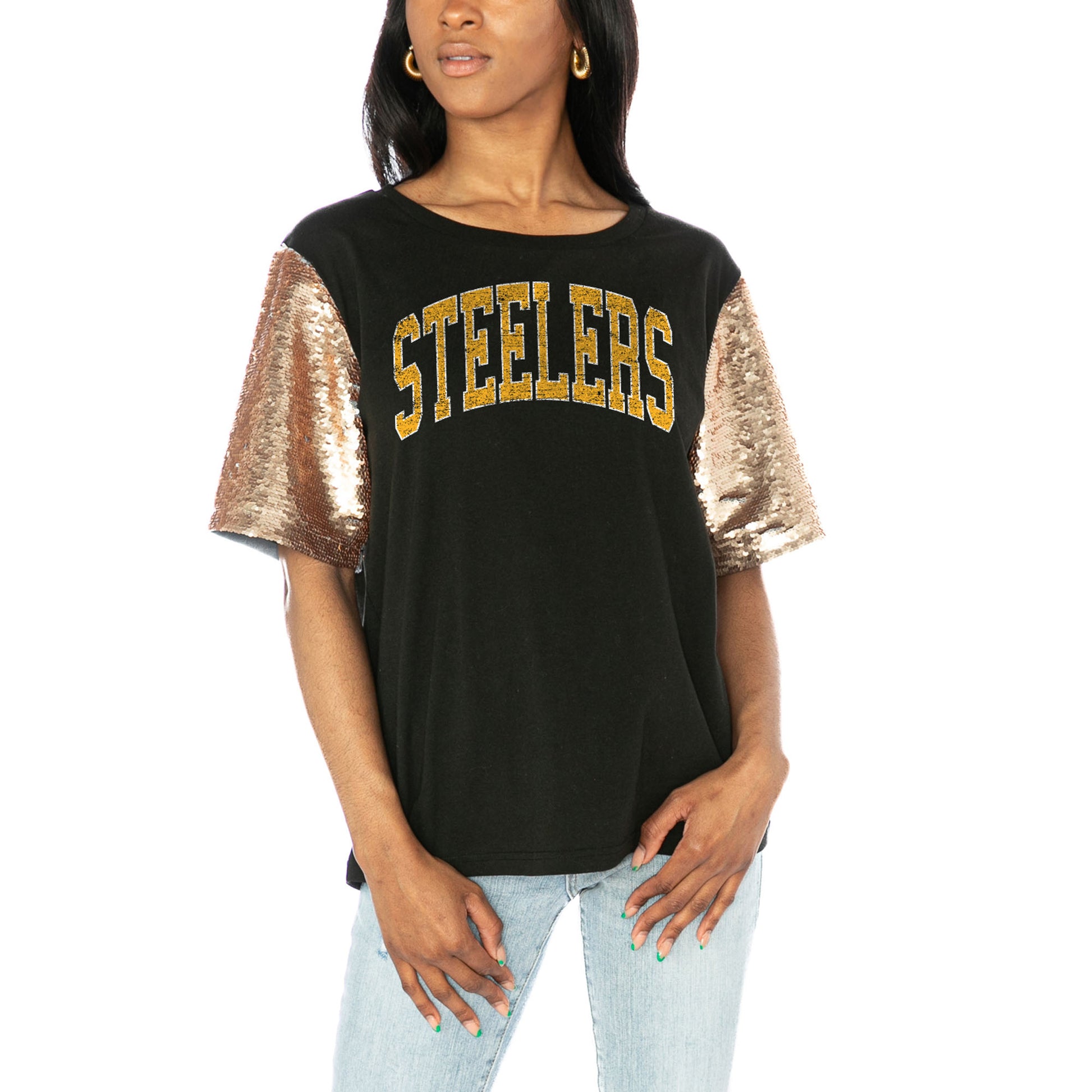 Women's Gameday Couture Black Pittsburgh Steelers Glamazon Flip Sequin Sleeve T-Shirt