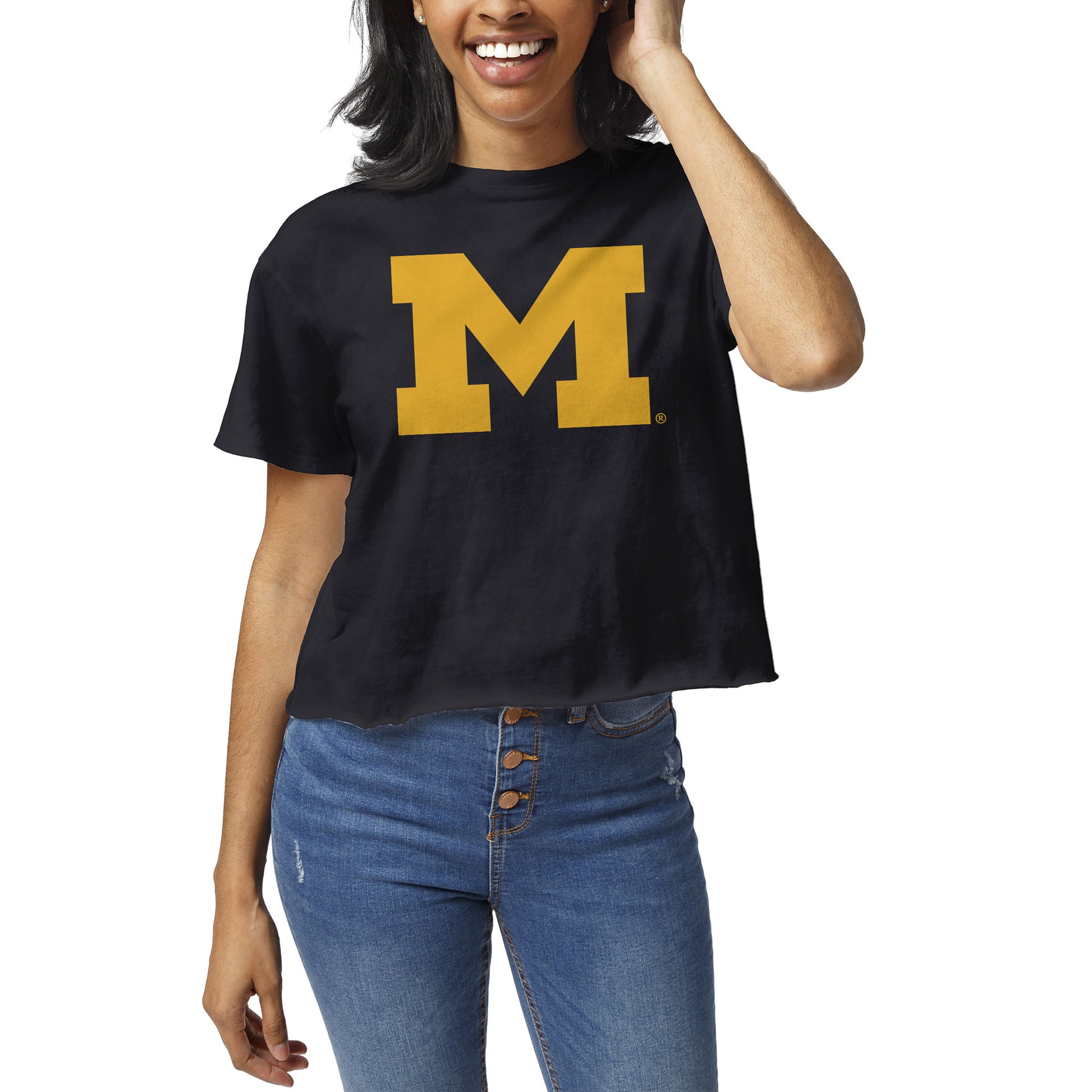 The Women's League Collegiate Wear Navy Michigan Wolverines Clothesline Crop T-shirt is the perfect way to show your support for the Michigan Wolverines. This cropped tee features a screen-printed graphic of the Michigan Wolverines logo, allowing you to proudly display your team spirit. The unfinished hem gives this shirt a casual, relaxed look, making it ideal for game day or any day. Crafted from soft cotton, this shirt ensures all-day comfort. Whether you're cheering on the team at the stadium or representing around town, this shirt is a must-have for any Michigan fan.