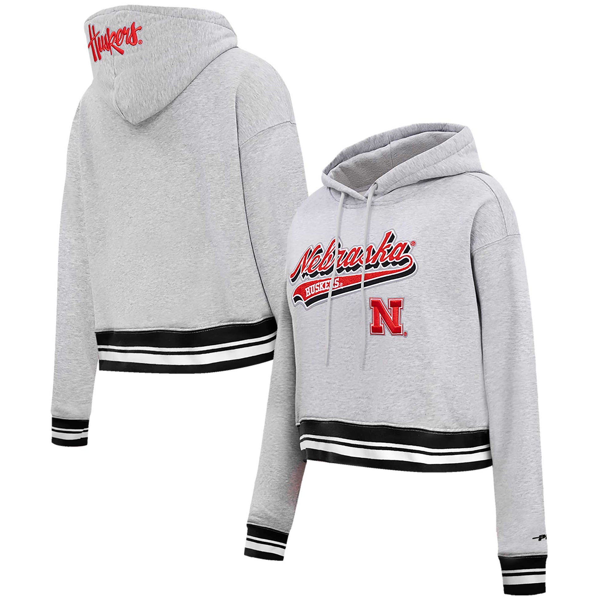 The Women's Pro Standard Heather Gray Nebraska Huskers Script Tail Fleece Cropped Pullover Hoodie is the perfect way to show your support for the Nebraska Huskers. This midweight hoodie is made of soft cotton and features heat-sealed fabric applique with embroidered and chenille details, a heat-sealed jock tag, and woven stripes. The cropped design, rib-knit cuffs, and waist hem provide a comfortable and stylish fit. Whether you're cheering on the Huskers at the game or relaxing at home, this hoodie is sure to keep you warm and comfortable.