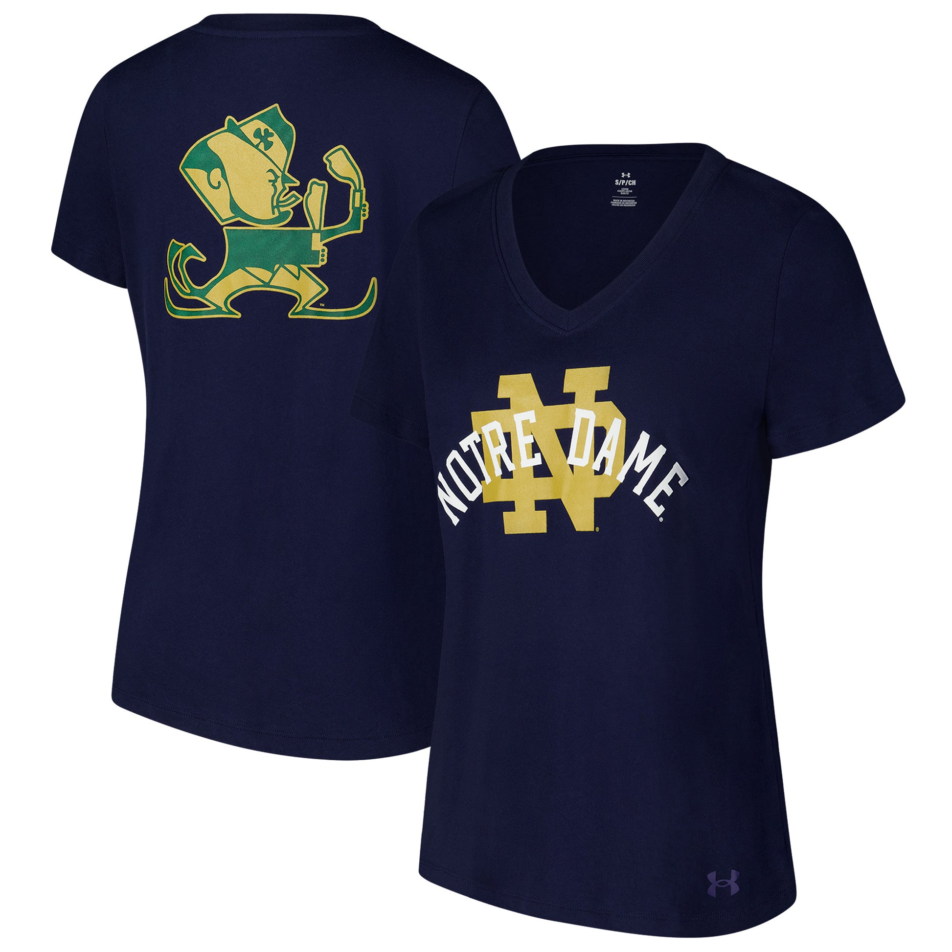 Amp up your team spirit with this Notre Dame Fighting Irish Logo T-shirt. Its design by Under Armour features eye-catching Notre Dame Fighting Irish logos printed on the front and back. The V-neckline adds a touch of style to this solid tee.