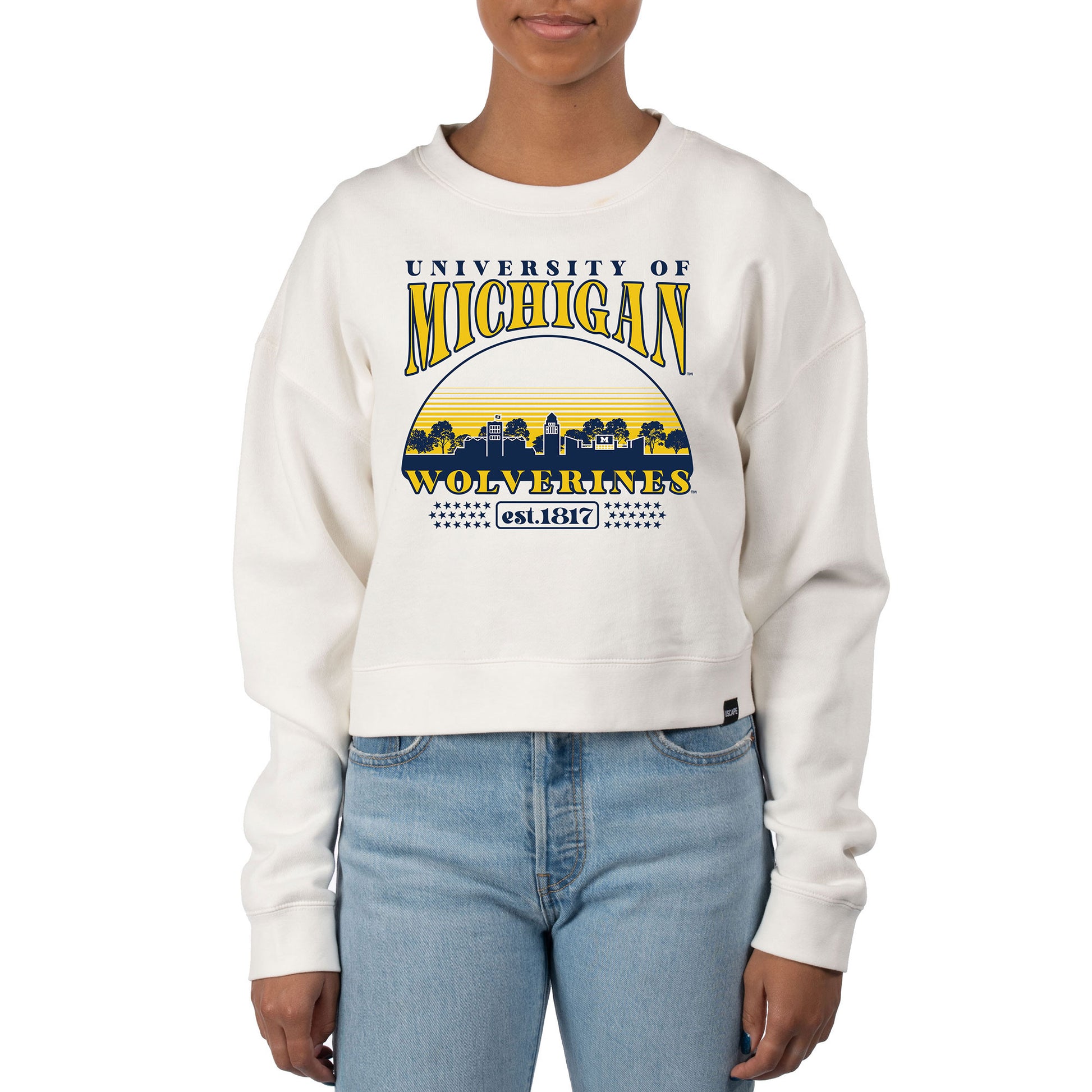 Women's Uscape Apparel Cream Michigan Wolverines Pigment Dyed Local Skyline Fleece Crop Crewneck Sweatshirt