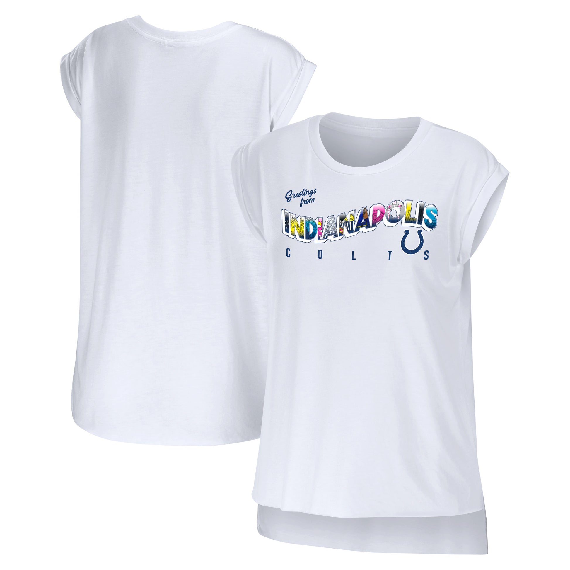 The Women's WEAR by Erin Andrews White Indianapolis Colts Greetings From Muscle T-Shirt is a must-have for any true Indianapolis Colts fan. With its screen print graphics and rounded hem with droptail, this shirt is both stylish and comfortable. Show your support for the Colts and your love for the city of Indianapolis with this unique and eye-catching t-shirt.